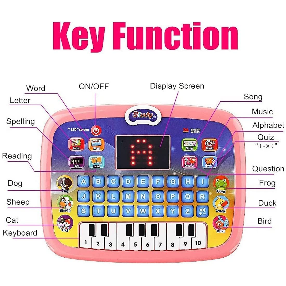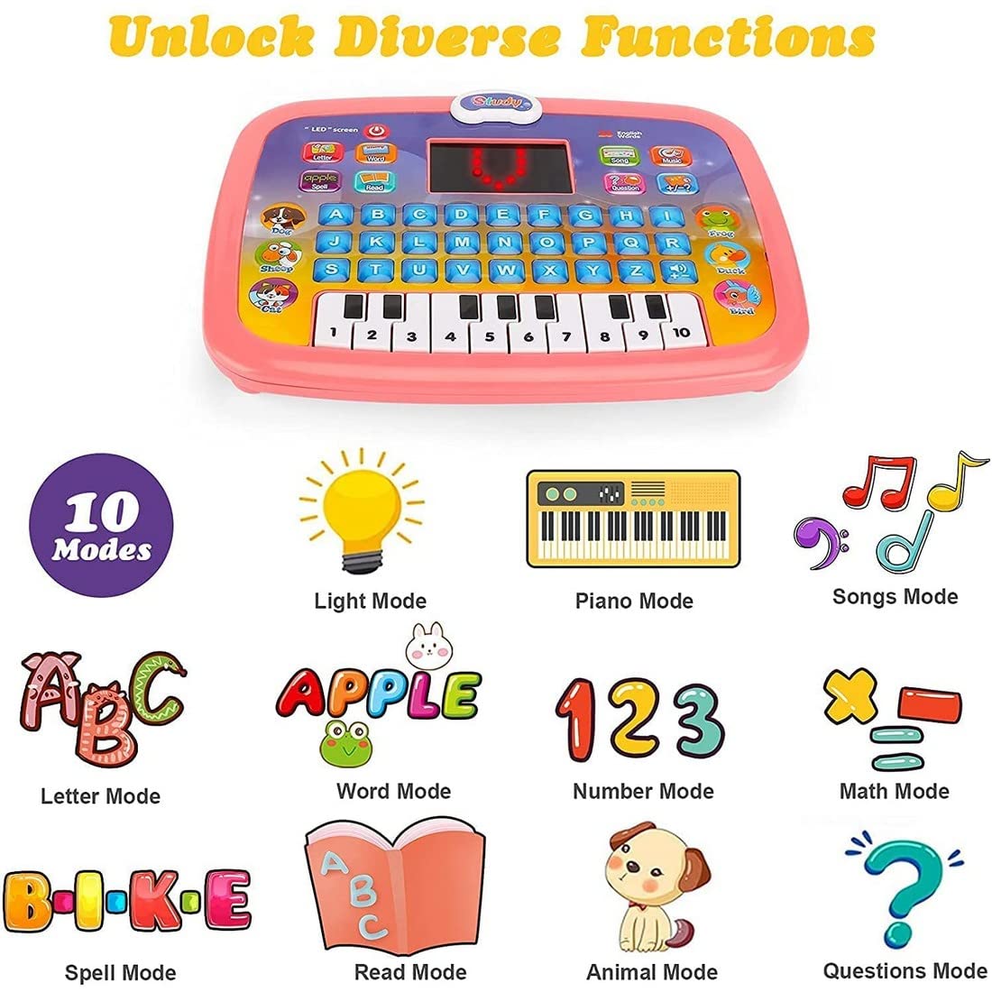 • Baby tablet is designed for over 1 year. The tablet toy helps toddlers learn letters A-Z, numbers 1-10, common animals and basic maths by pressing the buttons. This allows your baby to learn while playing.