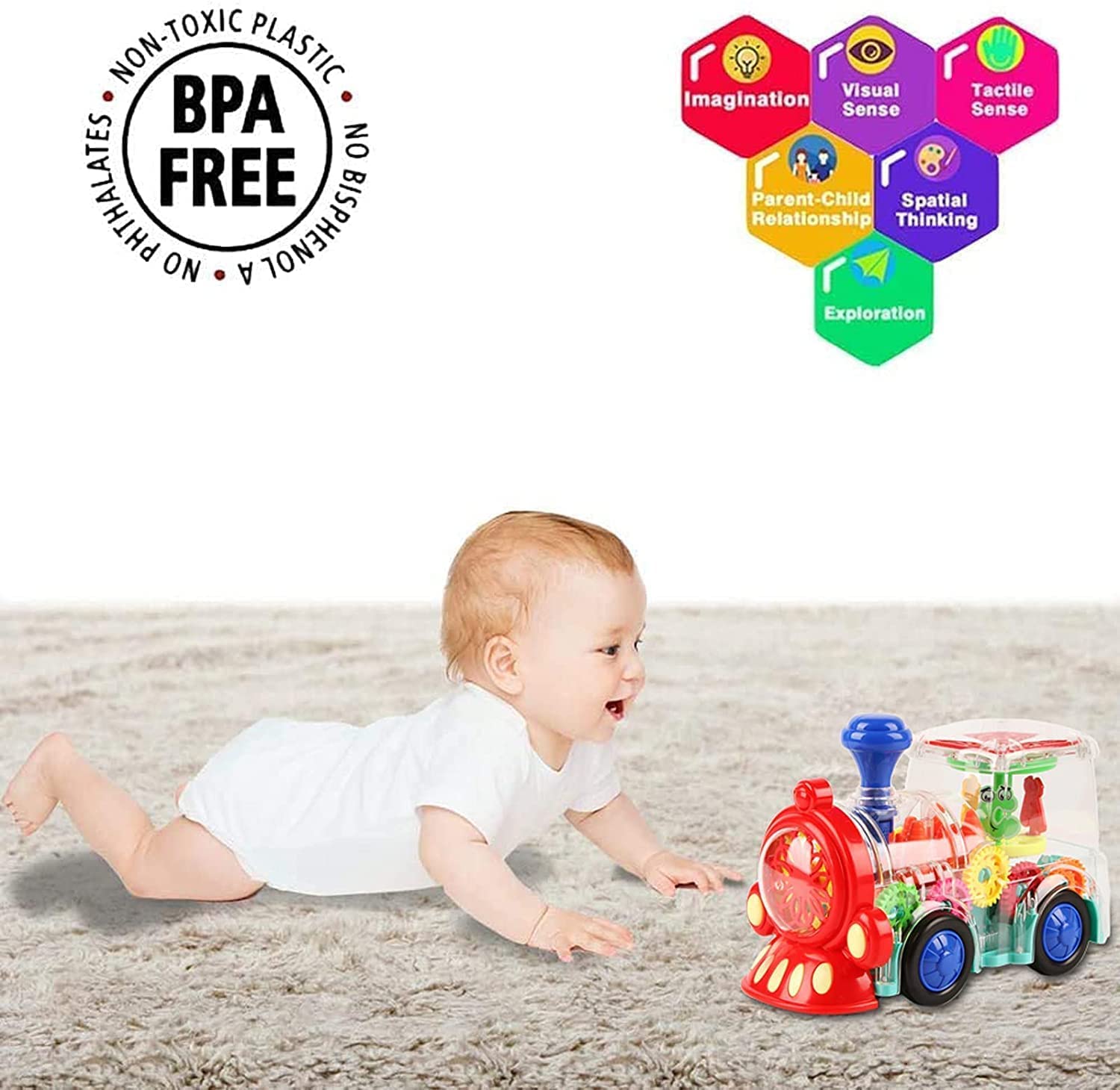 • UNIQUE DESIGN : Gear Driving Effect- Increases children’s observation ability.. Increase children’s cognitive ability. Transparent Concept Racing Bus with 3D Flashing Lights Bus with functions: Forward/ Backward, Stop. Unique Design – Transparent design, one Can see the gear inside, helps the kids to know mechanical concept.