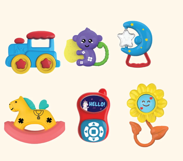 A cute and colorful crew of playful rattles! From trains to flowers, each piece brings gentle sounds, easy-grab shapes, and bright designs that spark instant joy and sensory exploration.