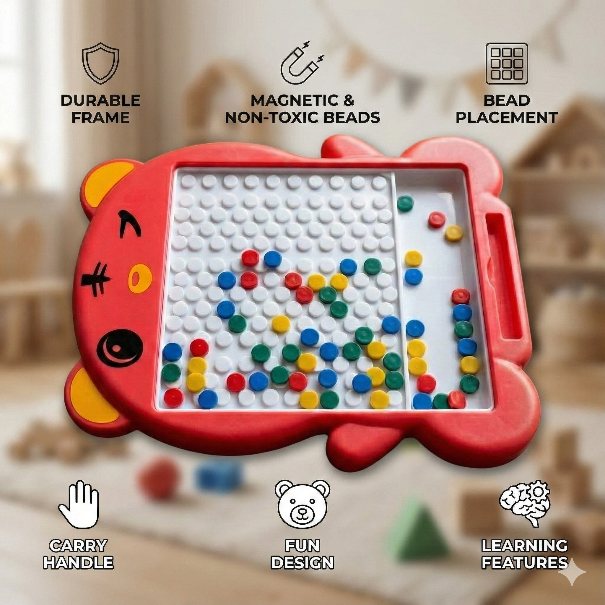 - 【Safe and Durable Magnetic Dot Board】 The Magnetic Dot Art set is made of durable and sturdy plastic. The colorful magnetic beans are sealed inside it with a transparent plastic panel, so the beans will not be lost or swallowed which is safe for your child to use.