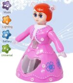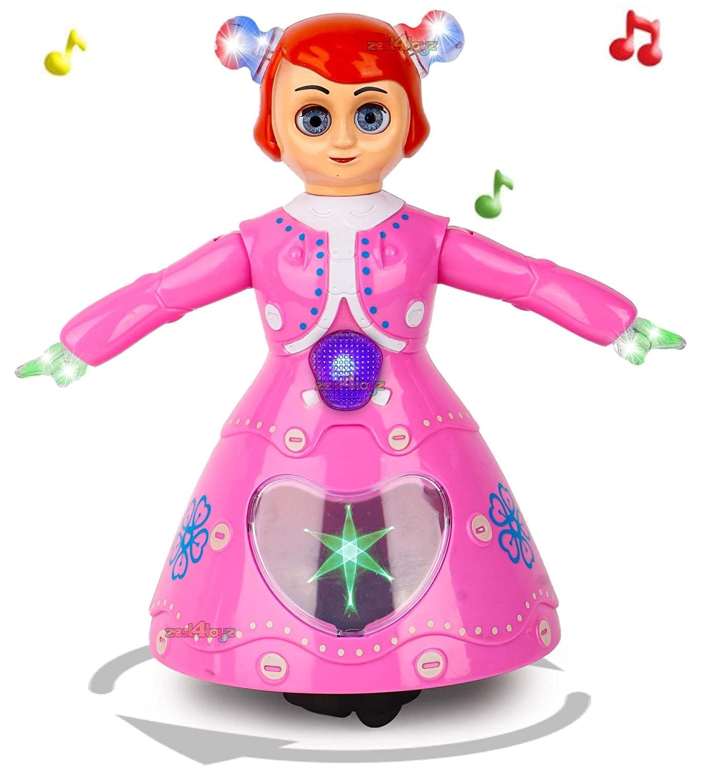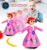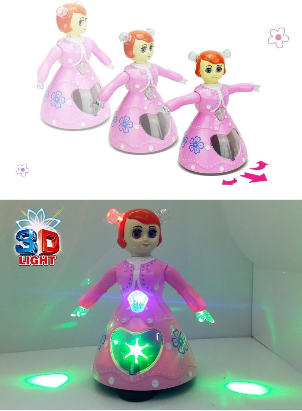 - Battery-operated musical princess doll with multi-color 3D lights and bump-and-go action. It moves across the floor and automatically changes direction when it bumps into obstacles.