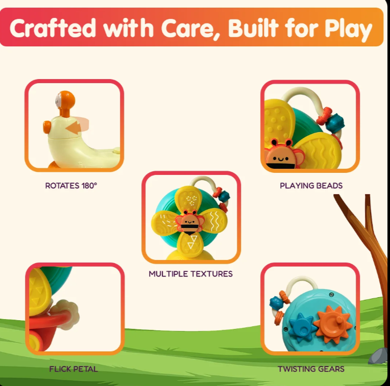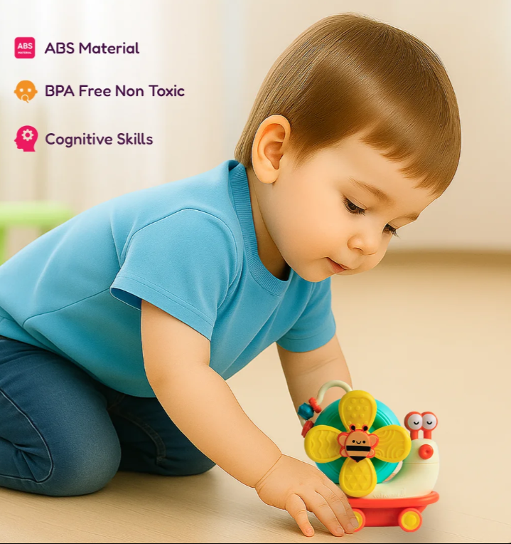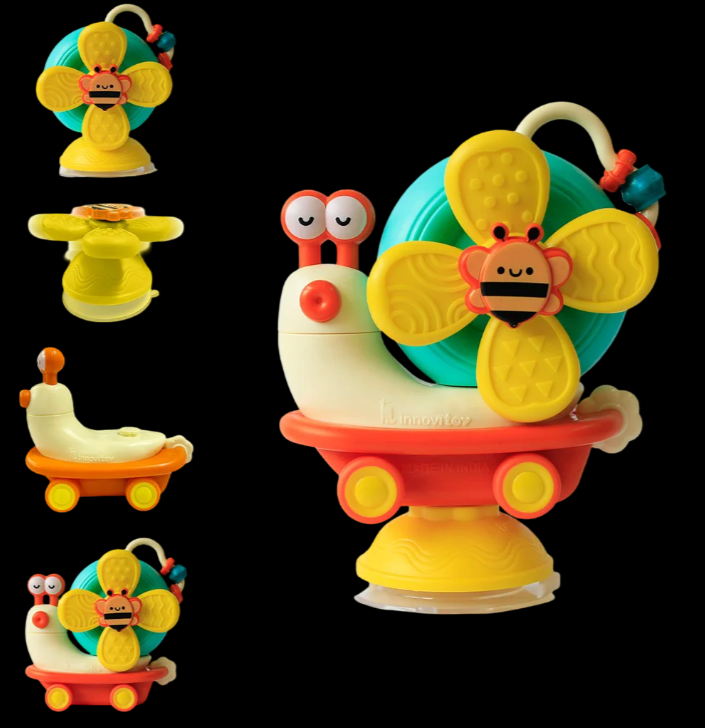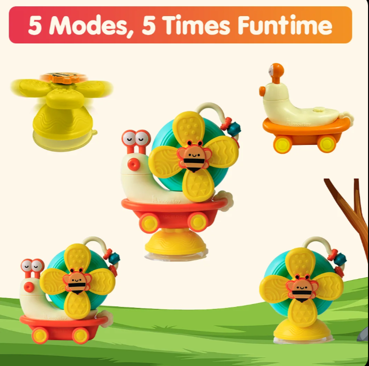 This happy snail is a 5-in-1 toy that spins, rolls, and suctions anywhere. Safe, soft blades and bright colors make it the ultimate distraction for happy babies. Guaranteed smiles.